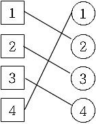 공화국에 있는 유스타운 시에서는 길을 사이에 두고 전봇대가 아래와 같이 두 줄로 늘어서 있다. 그리고 길 왼편과 길 오른편의 전봇대는 하나의 전선으로 연결되어 있다. 어떤 전봇대도 두 개 이상의 다른 전봇대와 연결되어 있지는 않다.