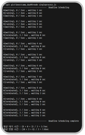 기한부 스케줄링의 경우 foreach함수를 이용하여 다음과 같은 결과를 얻었다. 이때 기한부 스케줄링은 deadline이 빠르고 동작시간 짧은 순 정렬해야 하기 때문에 아래의 과정을 통해 정렬해준다.