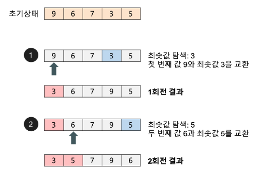 🔹 선택 정렬은 정렬되지 않은 데이터들에 대해 가장 작은 데이터를 찾아 가장 앞의 데이터와 교환해나가는 방식이다.