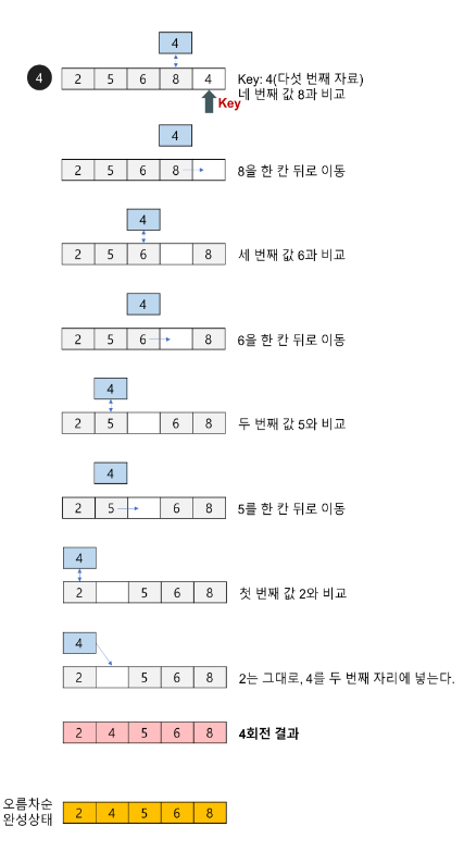 🔹 자료 배열의 모든 요소를 앞에서부터 차례대로 이미 정렬된 배열 부분과 비교 하여, 자신의 위치를 찾아 삽입함으로써 정렬을 완성하는 알고리즘