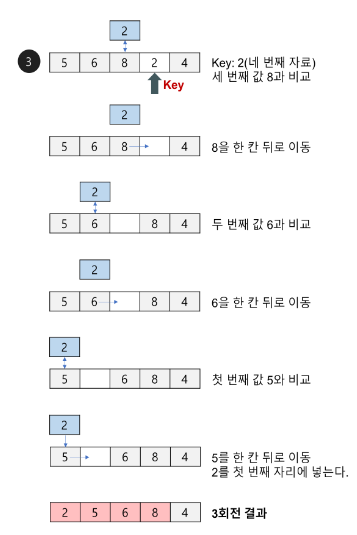 ◈ 3회전: 네 번째 자료인 2를 Key 값으로 해서 그 이전의 자료들과 비교한다.