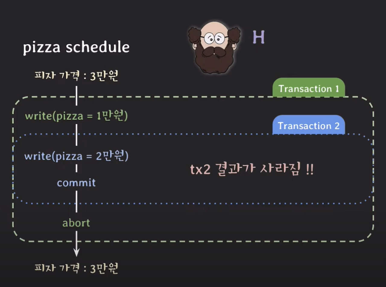 - 트랜잭션들이 어떻게 순서가 얽혀 있느냐에 따라서 이상한 결과가 나올 수도 있다.