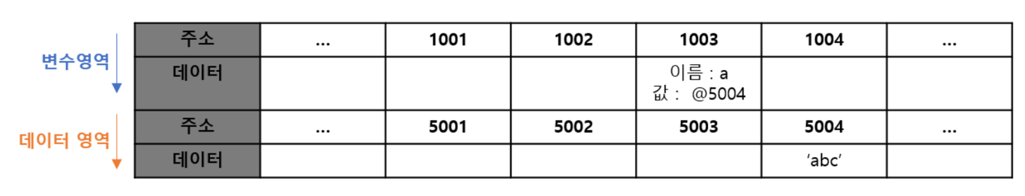 변수영역에 값을 바로 할당한다면, 숫자형은 8byte를 사용하니, 8 * 500 = 4000byte가 필요하게 된다. 하지만 변수영역과 데이터영역을 나눈다면, 주소공간의 크기를 2byte라고 했을 때, 2 * 500 + 8 = 1008 byte 공간이 필요하게 된다. 굳이 불필요한 메모리를 사용할 필요가 없게된다.