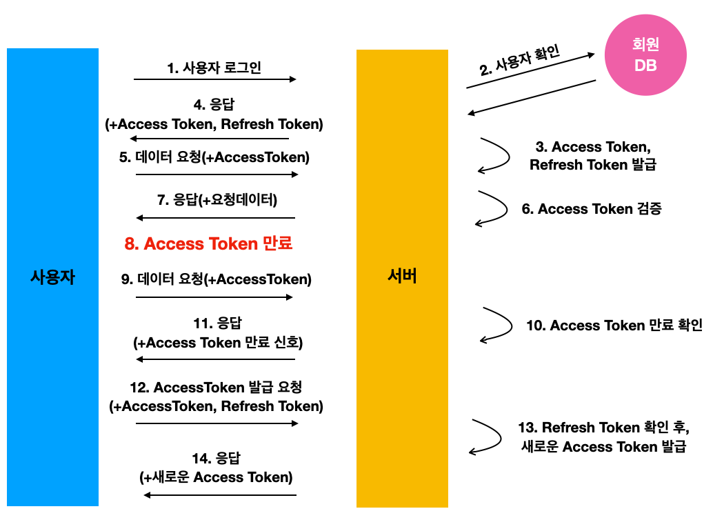 서버는 클라이언트에게 수명이 짧은 Access 토큰과 수명이 긴 Refresh 토큰을 발급하고 Refresh 토큰의 상응값을 데이터베이스에 저장한다. ( 이때 db에 저장하면 서버가 느려질 수 있기 때문에 redis를 사용할 수도 있다. ) 사용자는 Access 토큰의 수명이 다하면 Refresh 토큰을 서버에게 보낸다. 서버는 Refresh 토큰을 데이터베이스에서 조회해보고 맞다면 새 Access 토큰을 사용자에게 보낸다. 이 Refresh 토큰이 안전하게 관리된다면 Refresh 토큰이 유효할 동안에는 Access 토큰이 만료될 때마다 다시 로그인할 필요 없게 된다.