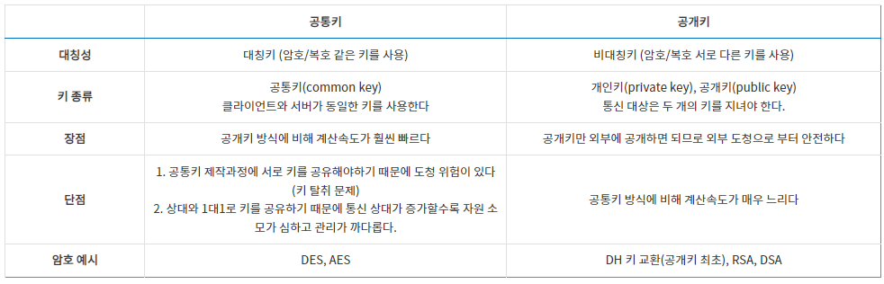 🖋 대칭키의 경우 비대칭 키 암호화 방식에 비해 계산과정이 단순하여 속도가 빠르지만 암호화와 복호화에 하나의 키(공통키)를 같이 사용하는 방식이기 때문에 상대방에게 키를 넘겨줄 때가 취약하다. 그래서 도청할 수 없도록 네트워크 통신 자체를 암호화해서 안전하게 배송하기 해줘야 한다.