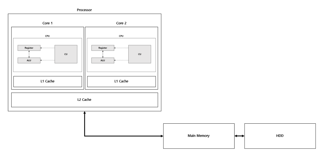 🖋 L1 캐시는 일반적으로 코어안에 내장되어 데이터 사용/참조에 가장 먼저 사용된다. L1 캐시는 보통 8~64KB 정도의 용량으로 CPU가 가장 빠르게 접근하며, L1 캐시에서 데이터를 찾지 못하면 L2 캐시를 참조한다.