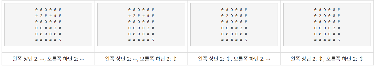 둘째 줄부터 N개의 줄에는 사무실 각 칸의 정보가 주어진다. 0은 빈 칸, 6은 벽, 1~5는 CCTV를 나타내고, 문제에서 설명한 CCTV의 종류이다.