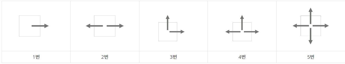 1번 CCTV는 한 쪽 방향만 감시할 수 있다. 2번과 3번은 두 방향을 감시할 수 있는데, 2번은 감시하는 방향이 서로 반대방향이어야 하고, 3번은 직각 방향이어야 한다. 4번은 세 방향, 5번은 네 방향을 감시할 수 있다.